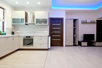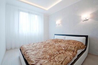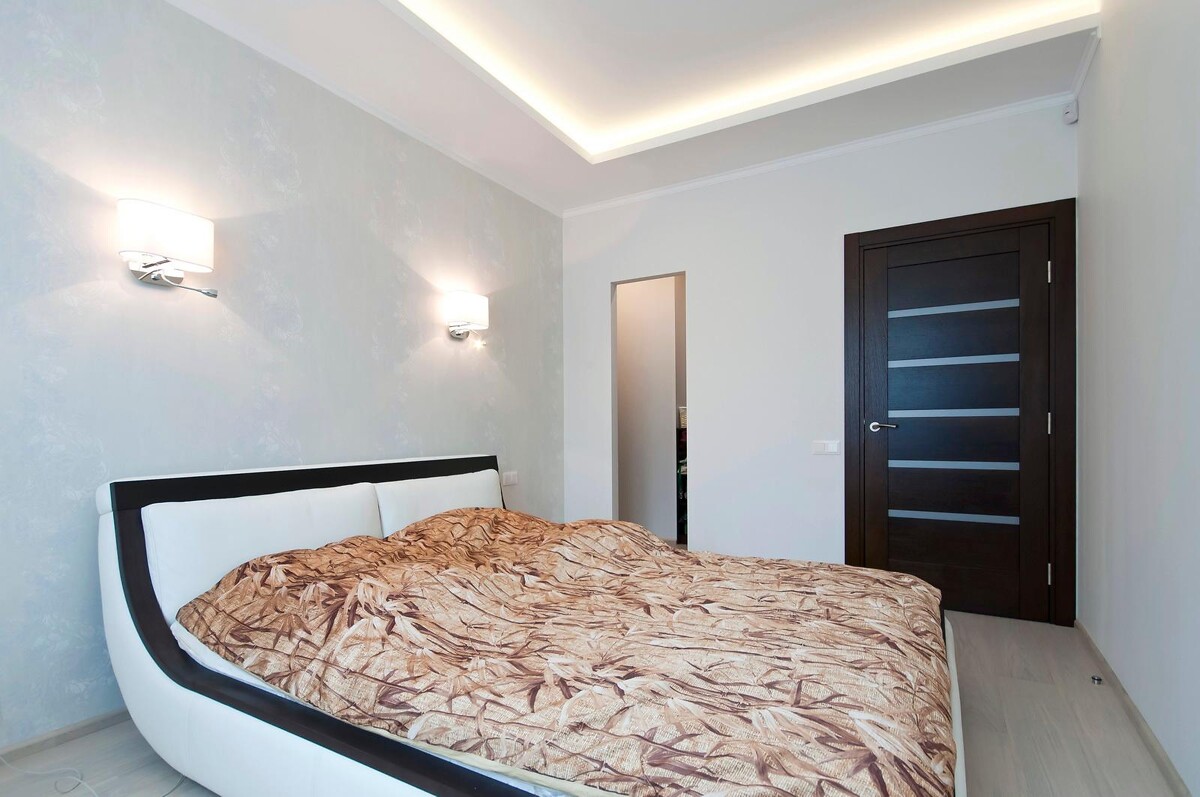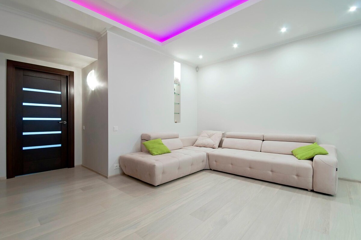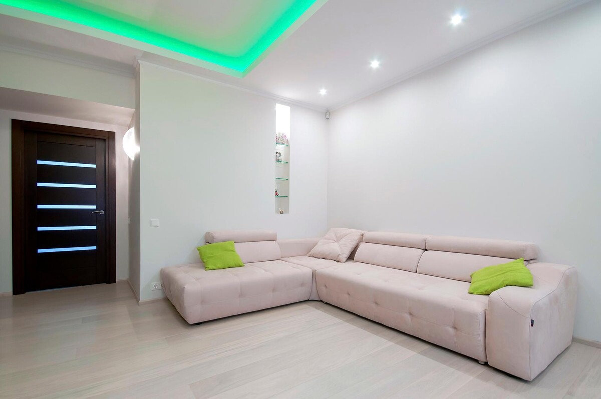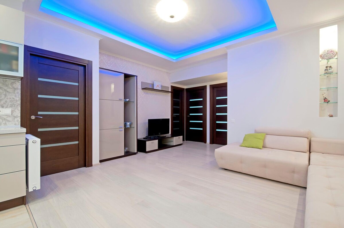 Потолки были сделаны по типу Knauf D113. Для звукоизоляции, над потолочной системой, были уложены листы минеральной ваты толщиной 50 мм. Теперь соседи сверху не смогут стать помехой спокойному отдыху. В гостиной и спальне установлен короб со скрытой диодной подсветкой.