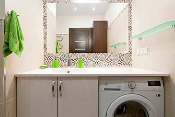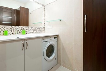 Рядом с ванной был установлен подвесной унитаз с функцией бидетты. Кроме того, для размещения ванных принадлежностей, были смонтированы стеклянные полочки и установлен электрический полотенцесушитель. Белая раковина из искусственного камня Silk Stone была изготовлена на заказ по конкретным размерам, поэтому она идеально вписалась во всю длину стены. Под нее была встроена стиральная машина и шкафчик для косметики и бытовой химии. Кроме этого, было изготовлено 2 более вместительных шкафа, один закрытый, а второй со стеклянной дверью. Вся мебель была изготовлена из влагостойкого материала. Для обеспечения своевременного отвода сырости, был установлен вентилятор с таймером.