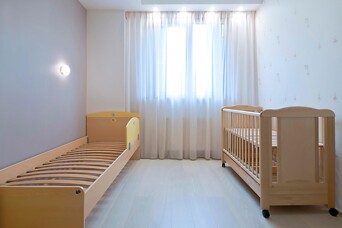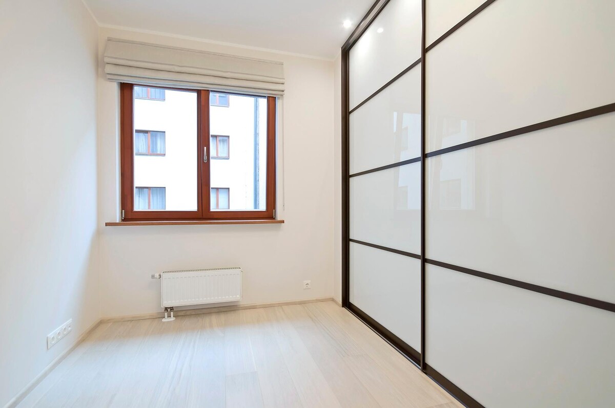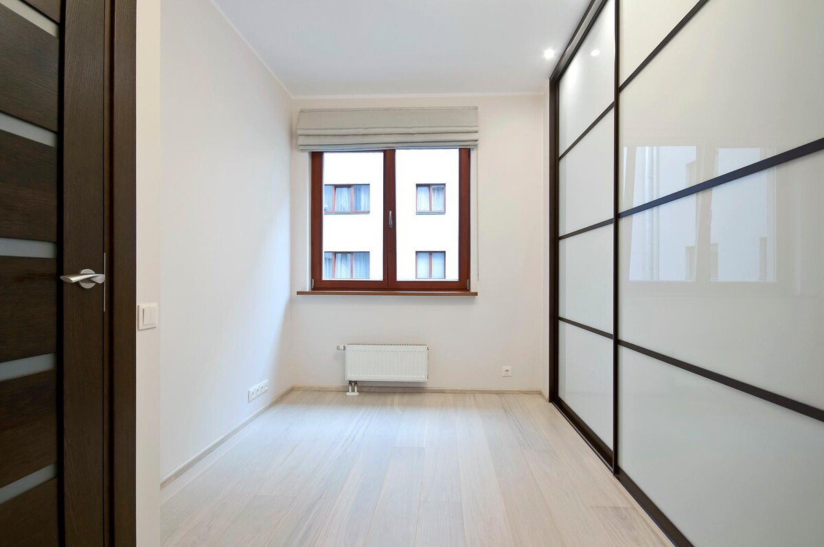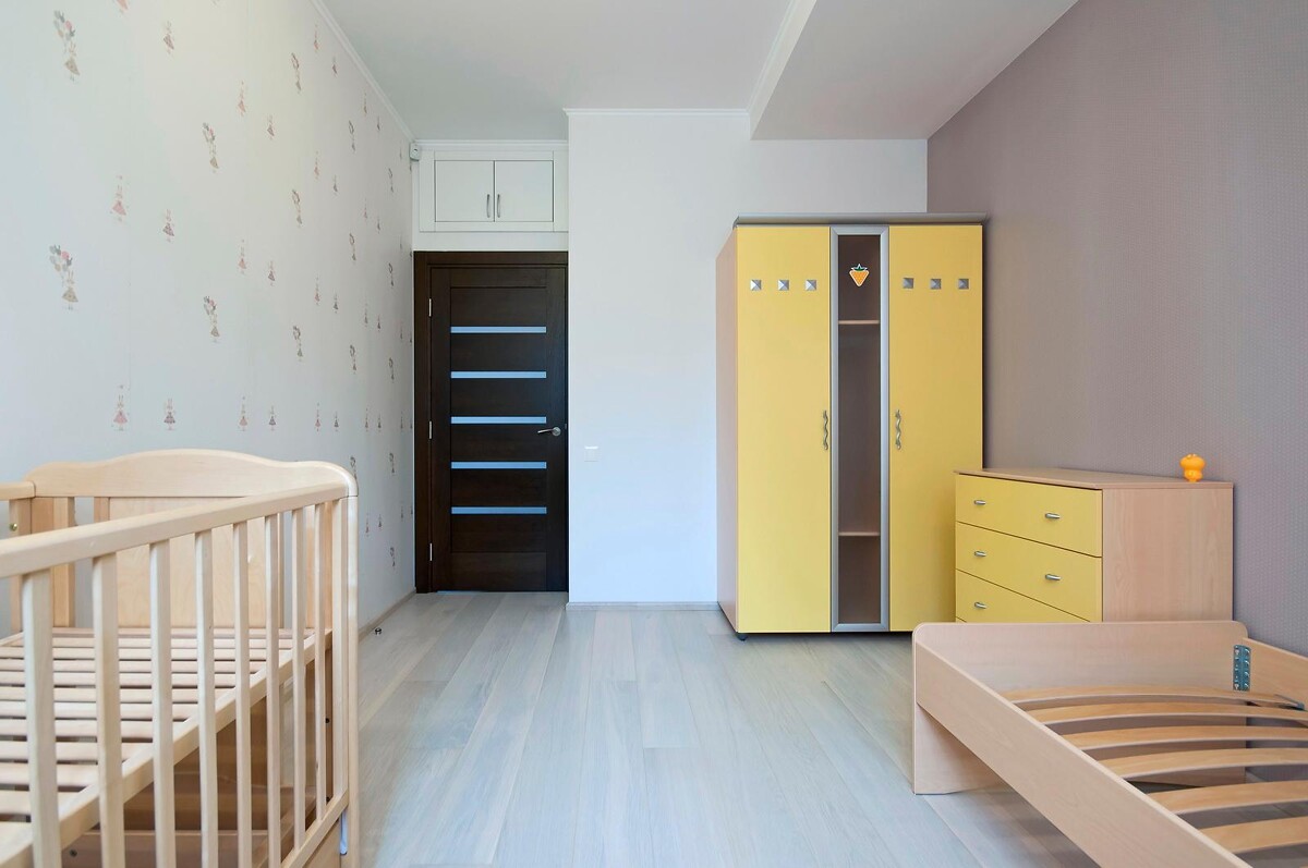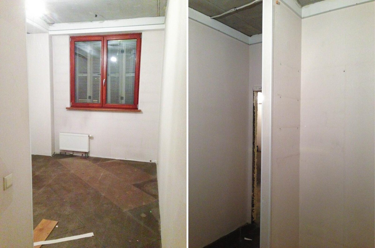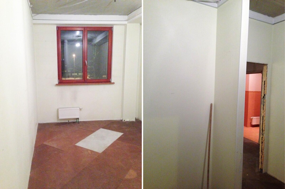 Кроме обновления напольного покрытия, потолки и стены также были отшпатлеваны. После высыхания отделки, две стены были оклеены обоями, а две — окрашены водоэмульсионной краской. Над дверью была установлена небольшая антресоль, дверки которой ведут из двух разных комнат — одни из детской, а другие из гардеробной.