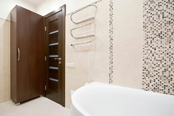 Радиатор в ванной комнате также не соответствовал плану, т.к. мешал установке мебели и сантехники. Было решено его ликвидировать, положив вместо него теплый пол. Он способен прогревать помещение на высоту 2-2.5 метра, поэтому подходит практически для любого жилого проекта. Такое отопление особенно хорошо зимой, ведь, как всем известно – ноги в тепле – это залог здоровья. Только мы не рекомендуем установку теплых полов при пробковом покрытии и для натурального паркета. Во-первых, эти материалы не бывают холодными сами по себе, а во-вторых, пробка слишком плохо проводит тепло, а паркет может рассохнуться.