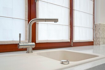 Благодаря дизайнерской задумке и работе строителей, раковину и рабочую поверхность удалось переместить напротив кухонного окна. Это не только очень красиво, но и позволяет обеспечить естественное освещение самых активных зон как можно дольше.