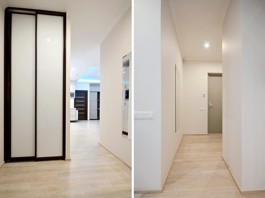 Для прихожей был спроектирован встроенный шкаф купе для обуви и верхней одежды, а также установлено зеркало и две направленные светодиодные лампы.