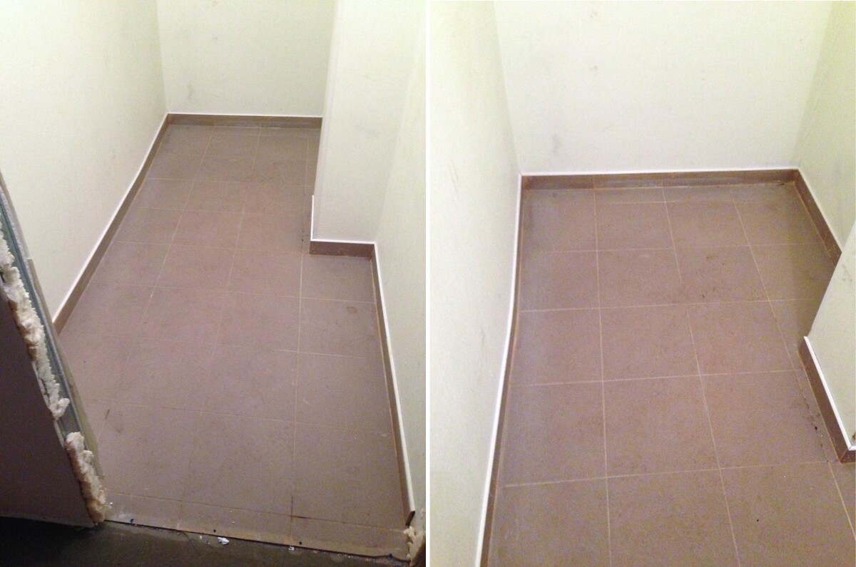 Пол в этих помещениях был немного приподнят, исходя из различий в толщине плитки и паркета, чтобы избежать ступеньки (порога) в местах, где соприкасаются плитка и паркет.