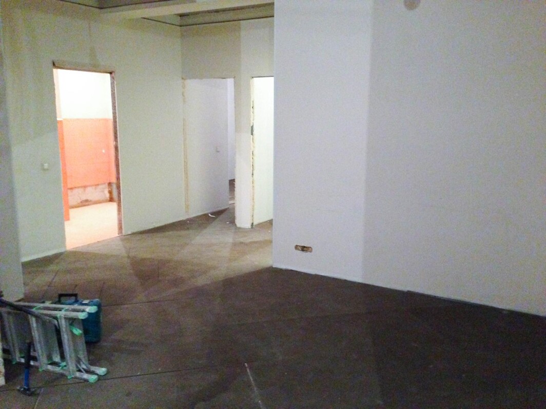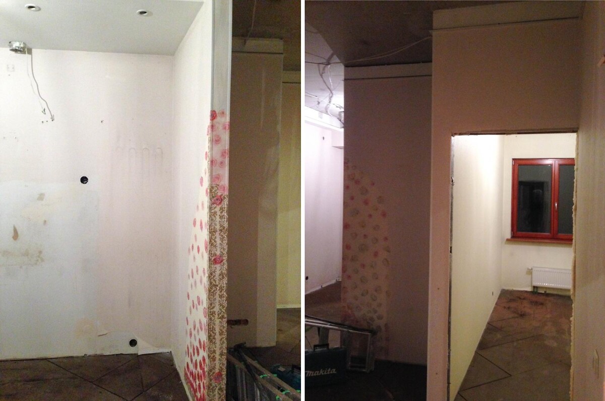 Подвесные потолки и ламинат отсутствовали. Работа началась с демонтажа перегородок, а также плитки в ванной комнате и гардеробной. На всех стенах были поклеены обои под покраску, которые были аккуратно сняты.