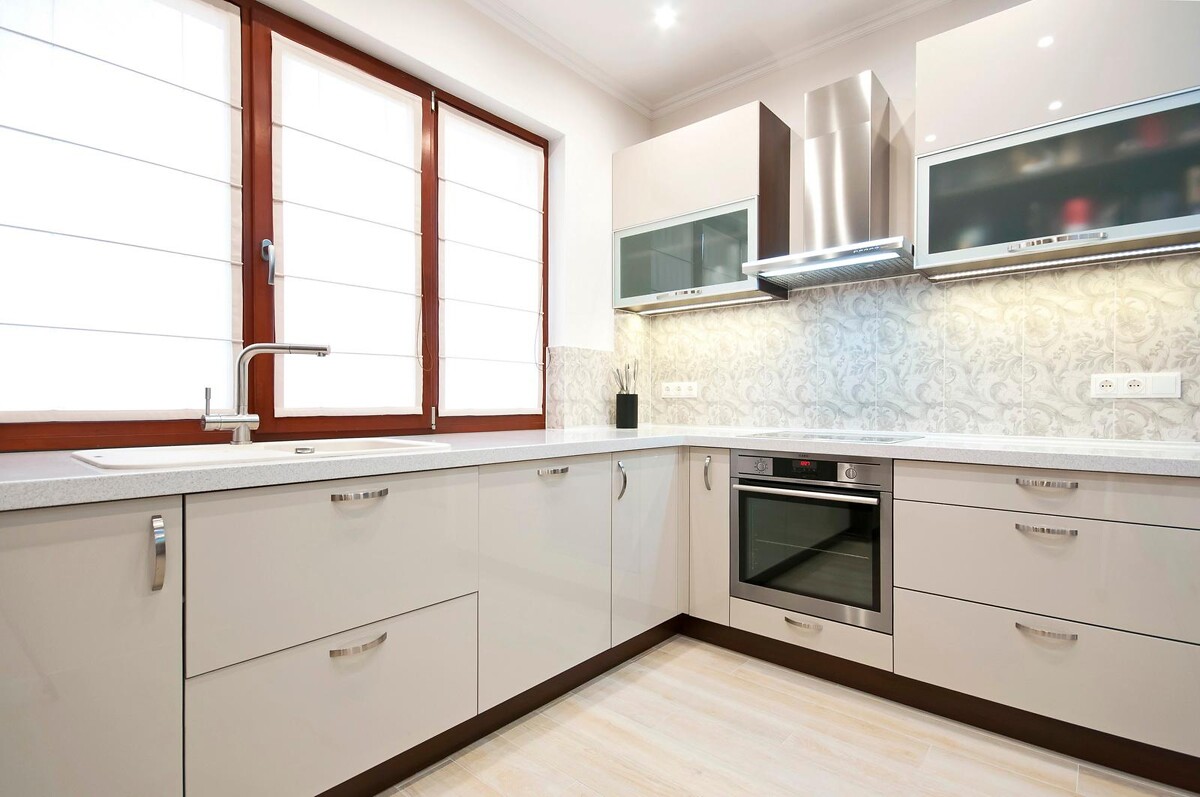 Для того, чтобы провести вентиляцию к вытяжке, была использована плоская пластиковая труба. За счет этого нам удалось опустить вентиляционную трубу к вытяжке внутри перегородки и кожух от вытяжки теперь идет до высоты подвесных шкафчиков, а не до потолка.